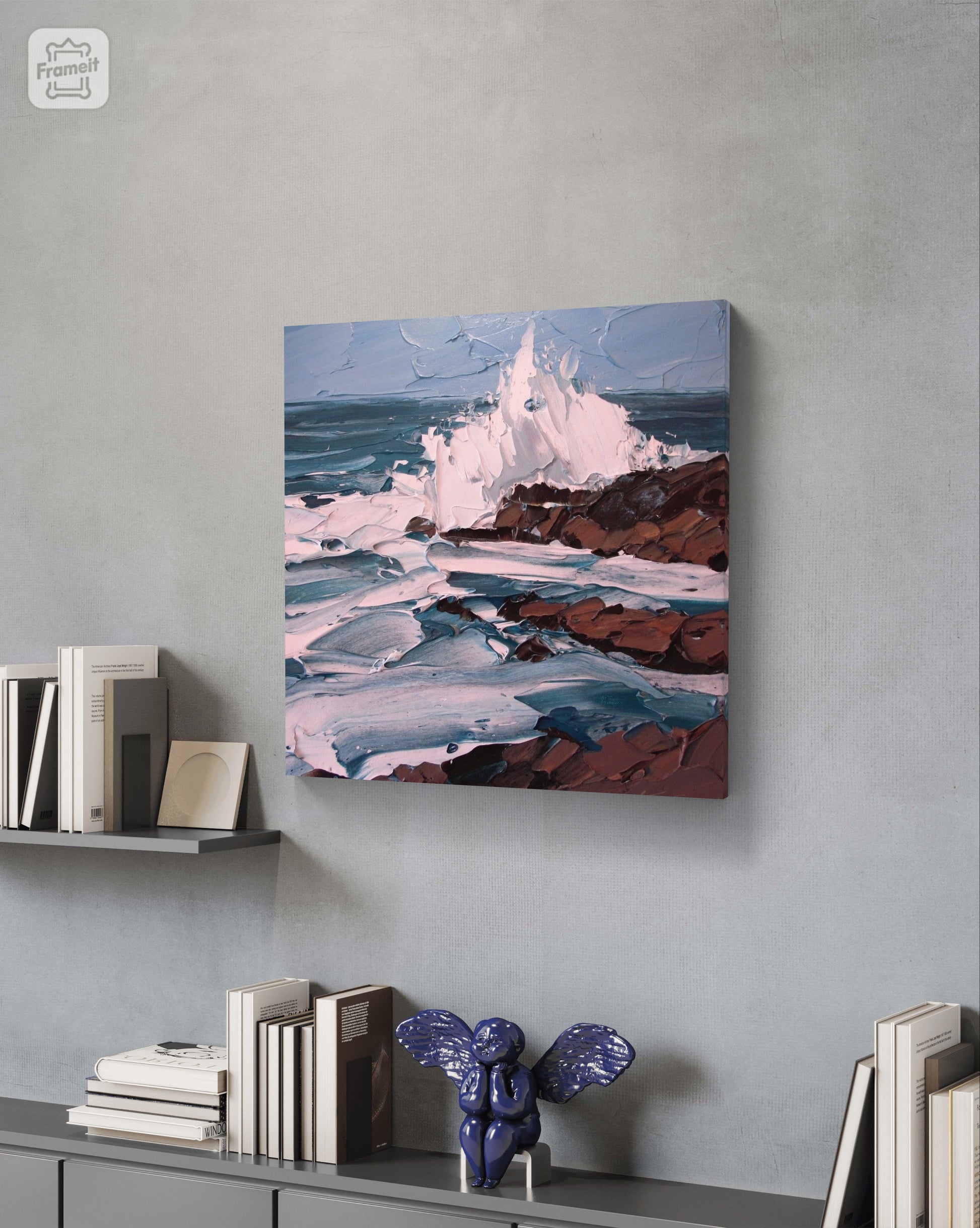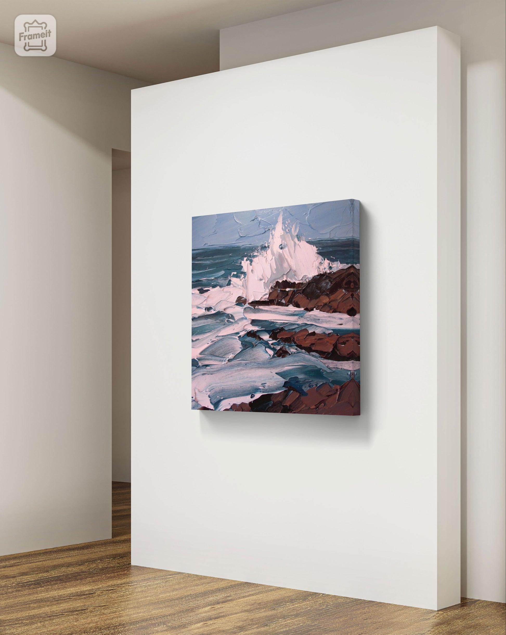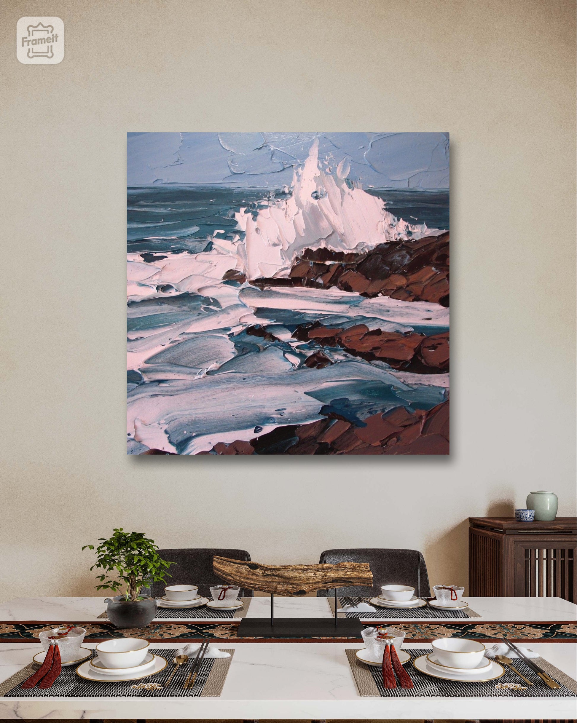 Immerse yourself in the captivating energy of “Ocean’s Embrace,” a stunning abstract painting that vividly captures the dynamic interplay between sea waves and rocks. This masterpiece, is a symphony of color and motion, bringing the untamed beauty of the ocean right into your space.