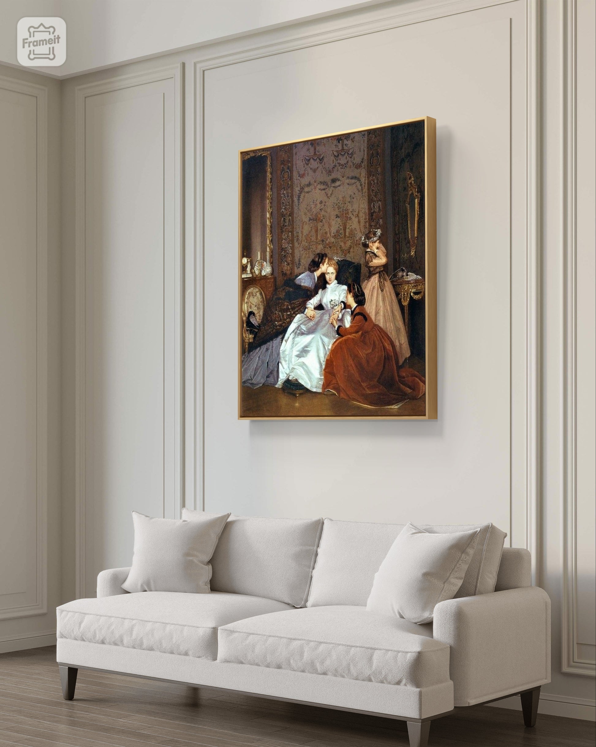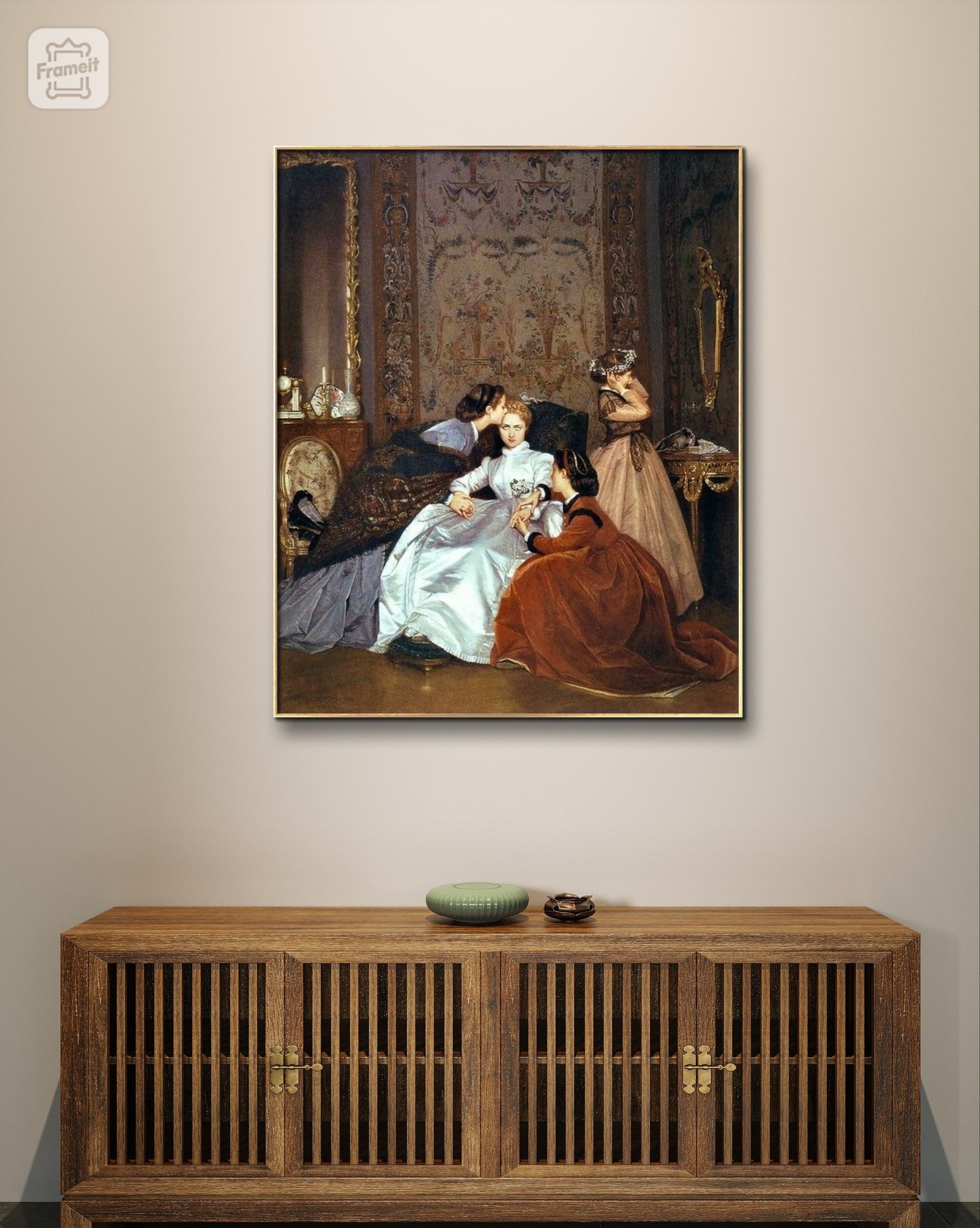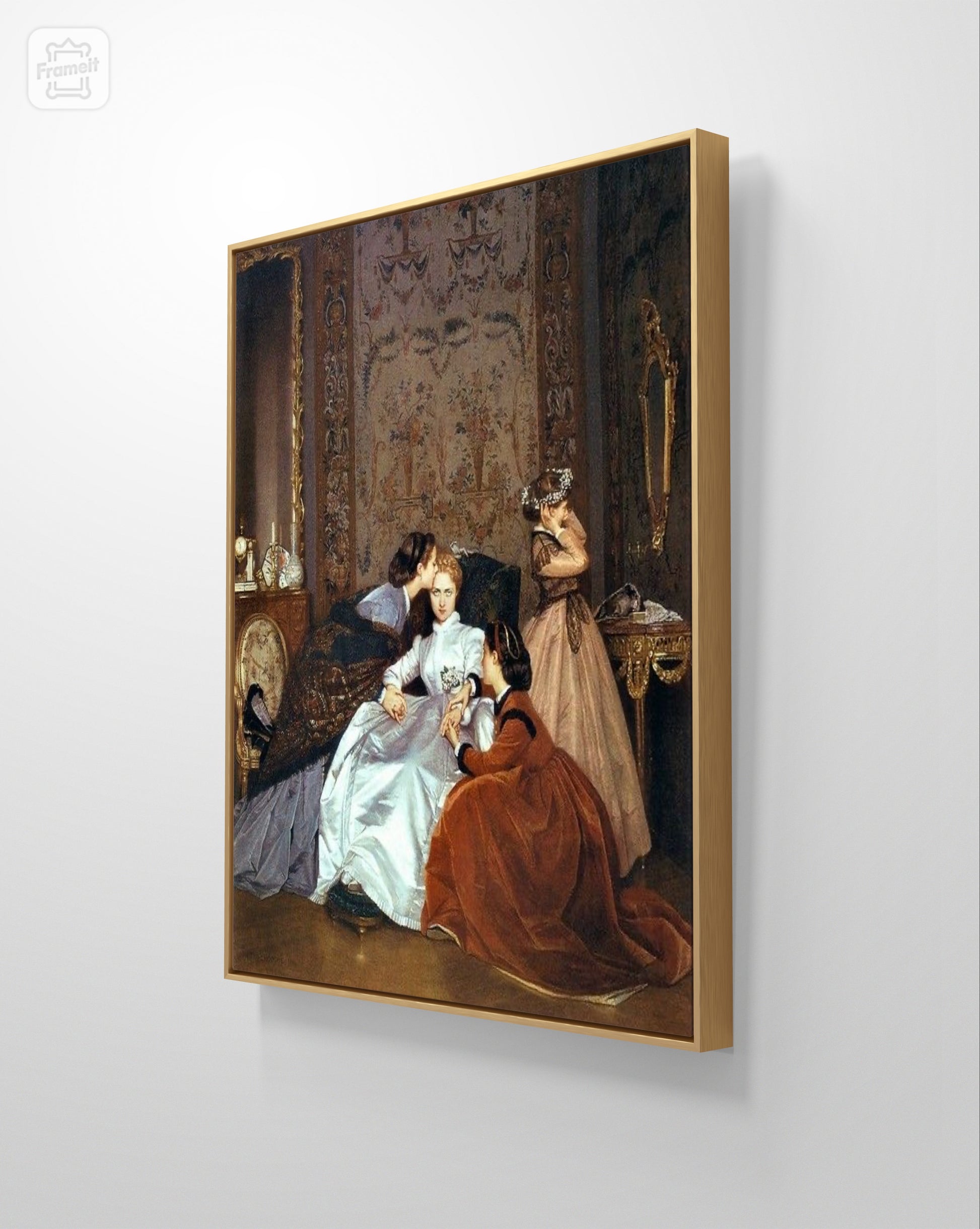 The scene may be set in shortly before the wedding of the central young woman, waiting in a parlour or drawing room with her bridesmaids. Her expression may express hostility, or perhaps resignation to her arranged marriage. The figures congregate in the lower half of the canvas, with upper half devoted to the flamboyantly decorated room and its gilded furniture.
