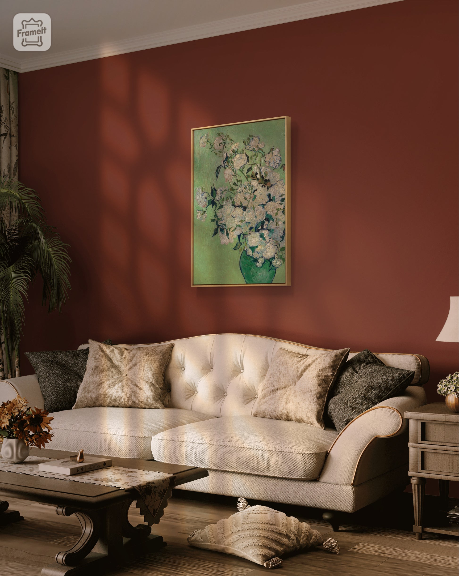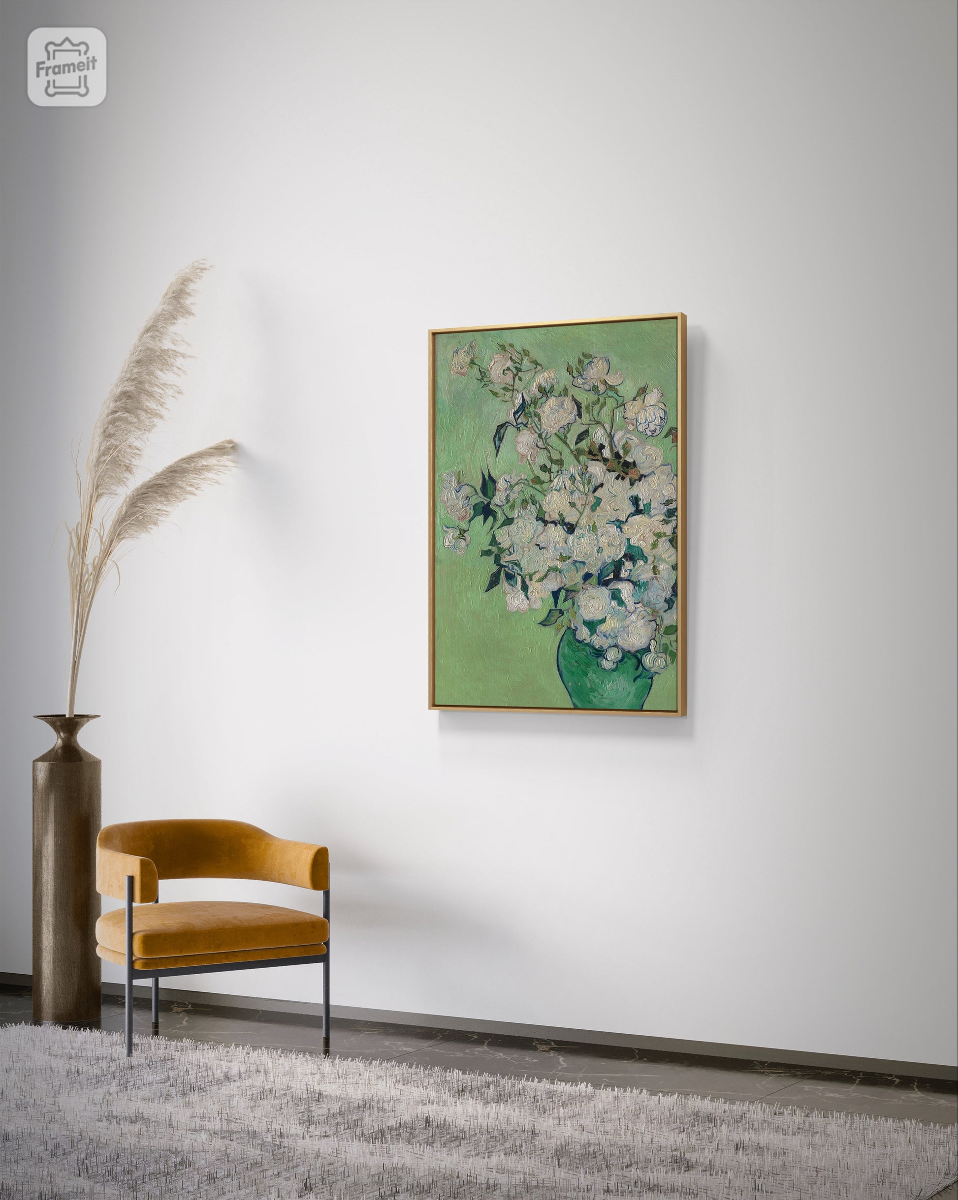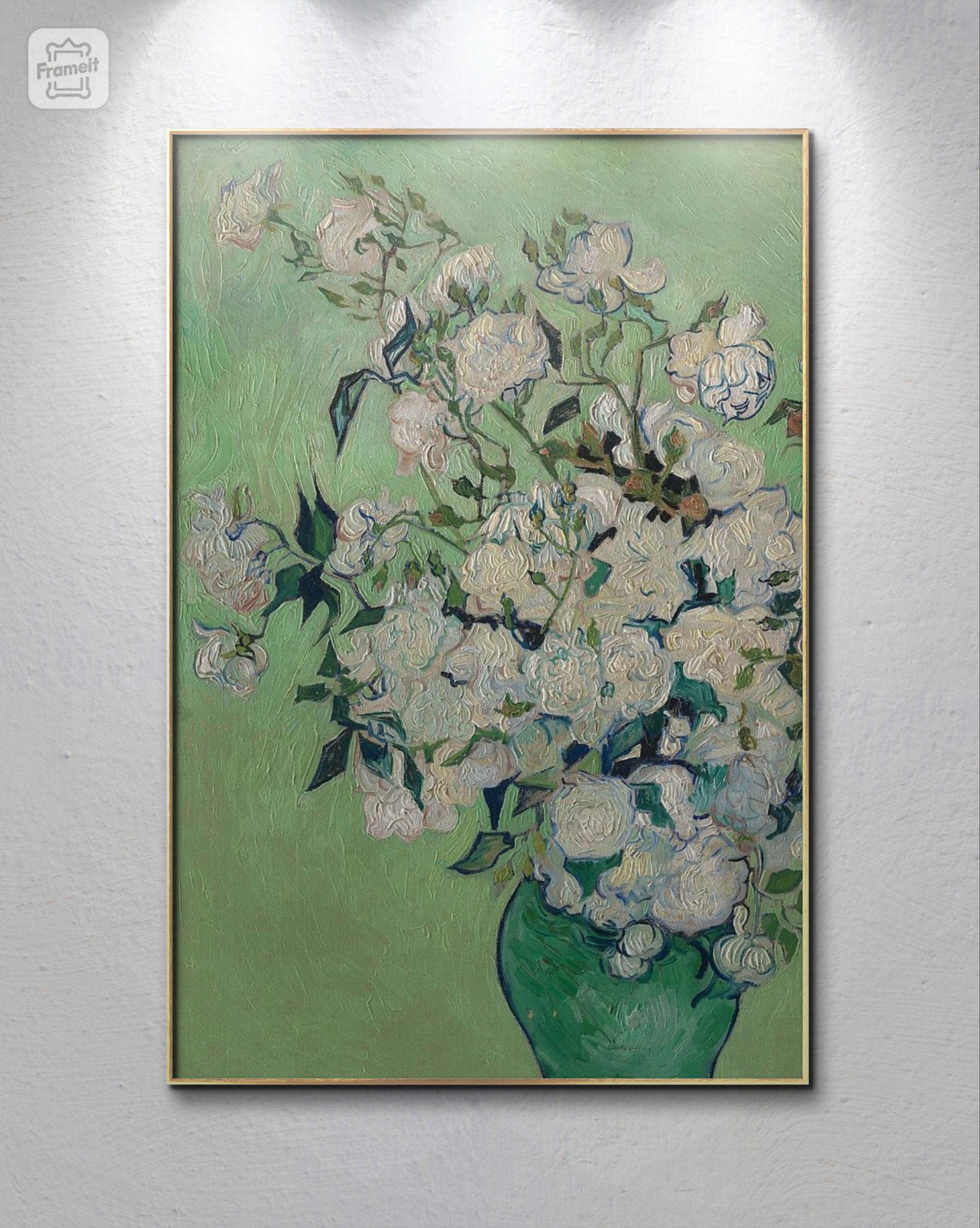Adorn your walls with Vincent van Gogh's stunning "Vase of Roses" painting, beautifully framed in brown. Brighten up any space with the vibrant colors and intricate details of this masterpiece, sure to add a touch of elegance to your home. Expertly crafted and a must-have for any art enthusiast.